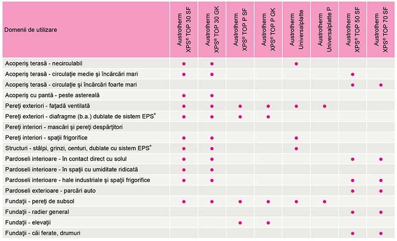 Polistirenul extrudat Austrotherm XPS® TOP asigură o termoizolaţie eficientă de la subsol până la acoperiş, acolo unde sunt încărcări mecanice extreme şi grad mare de umiditate. Cu Austrotherm XPS® TOP se obţin rezultate ideale în cazul termoizolaţiilor la pereţii de subsol, la socluri, planşee, terase, sub radierul de fundaţie, în încăperile umede etc.